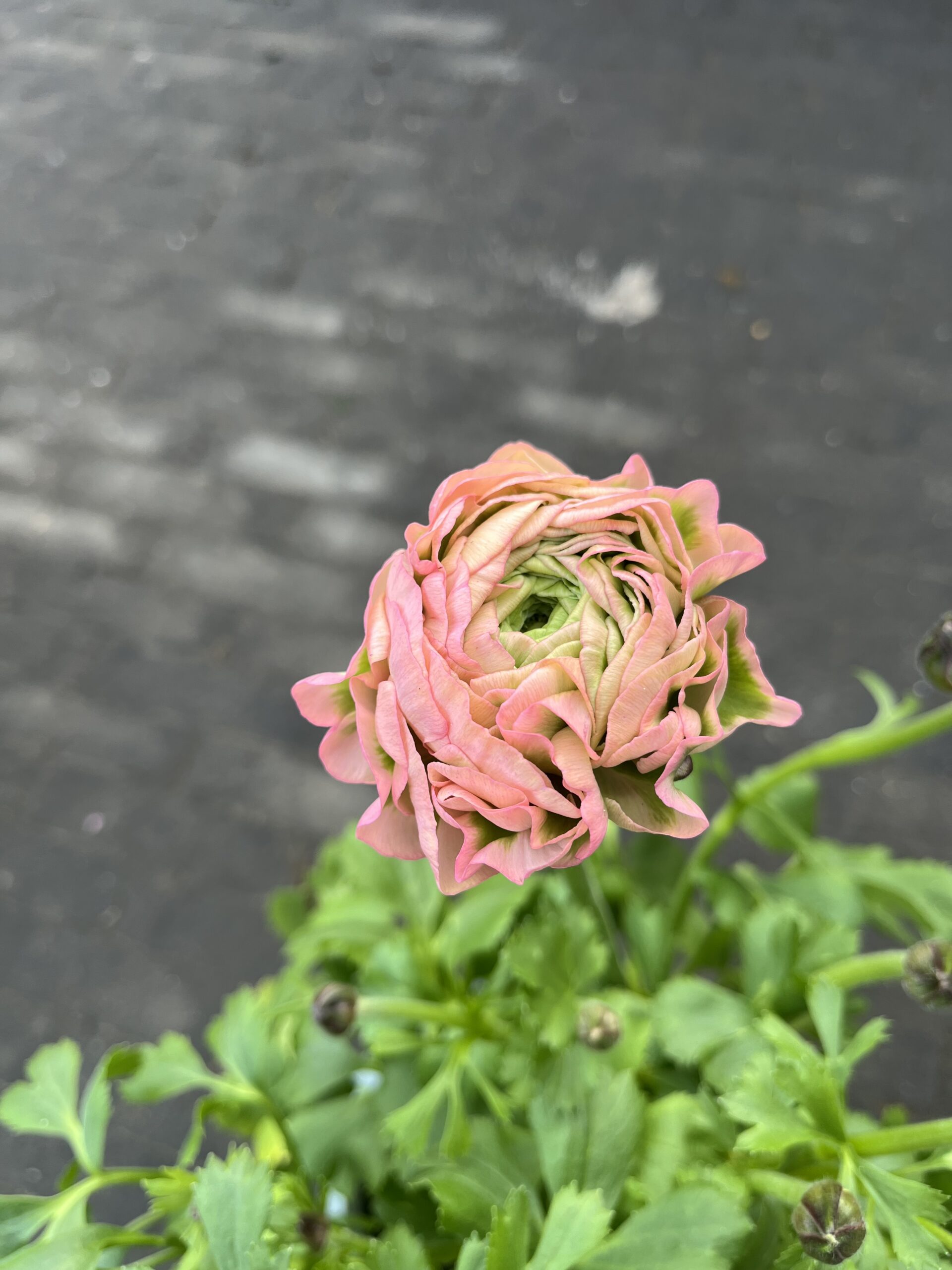 ラナンキュラス『ポンポン』:多年草 2月~4月頃。イタリアの種苗会社が開発した変わり咲ラナンキュラスで従来は切り花系の品種っぽそうです。花弁がかなり丸っぽく一輪のボリューム感が凄いです。それでいて、グリーンが入るユニークさです。