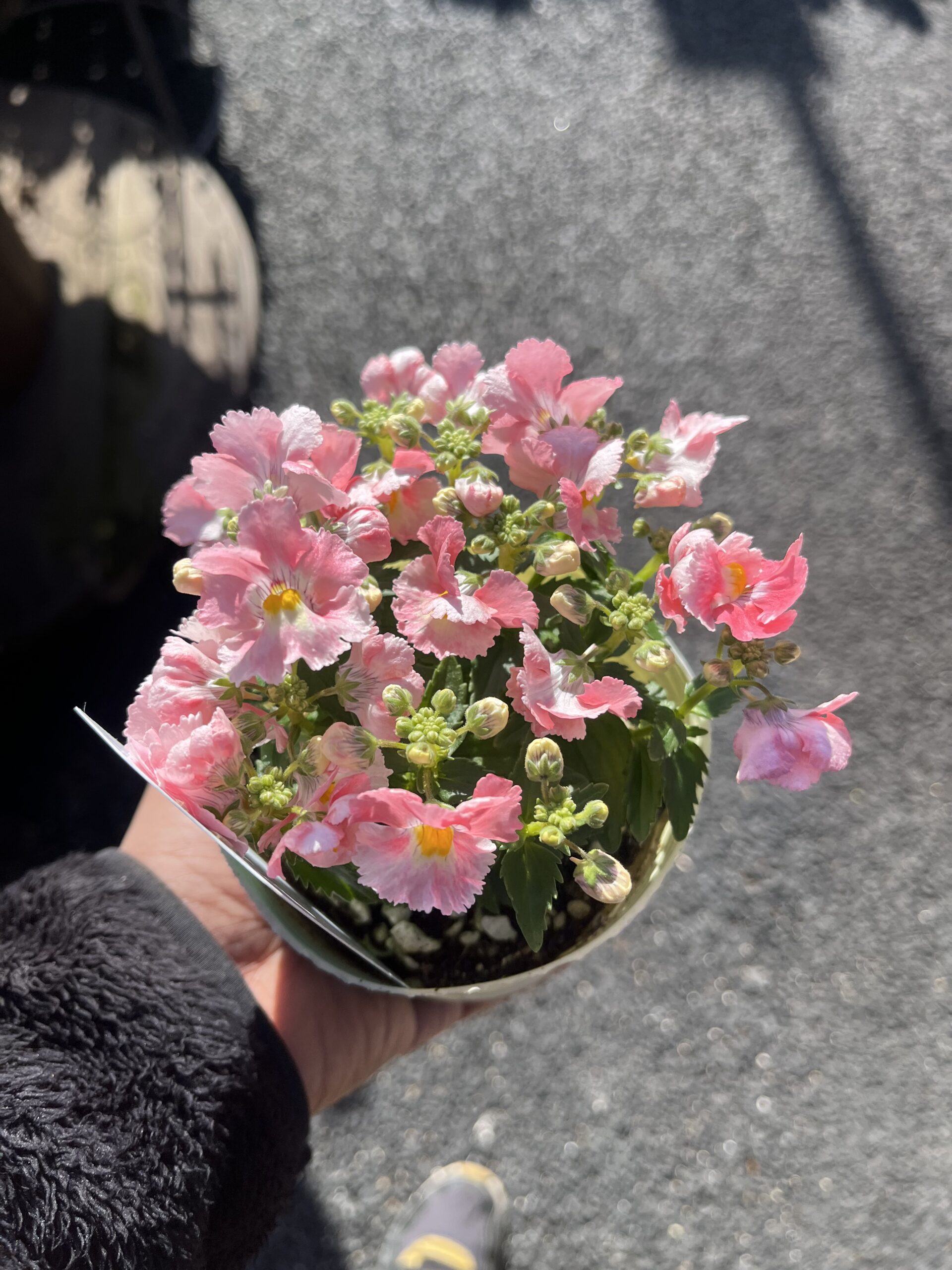 ネメシア『ピーチドロップ』半耐寒性多年草:開花期2月~5月頃。タキイ種苗さんからの試作品種。コンパクトにまとまってネメシアにしては大輪のお花。春にぴったりの柔らかいピンクでとっても可愛い品種です。水はけの良い土に植え込むと長持ちしますよ