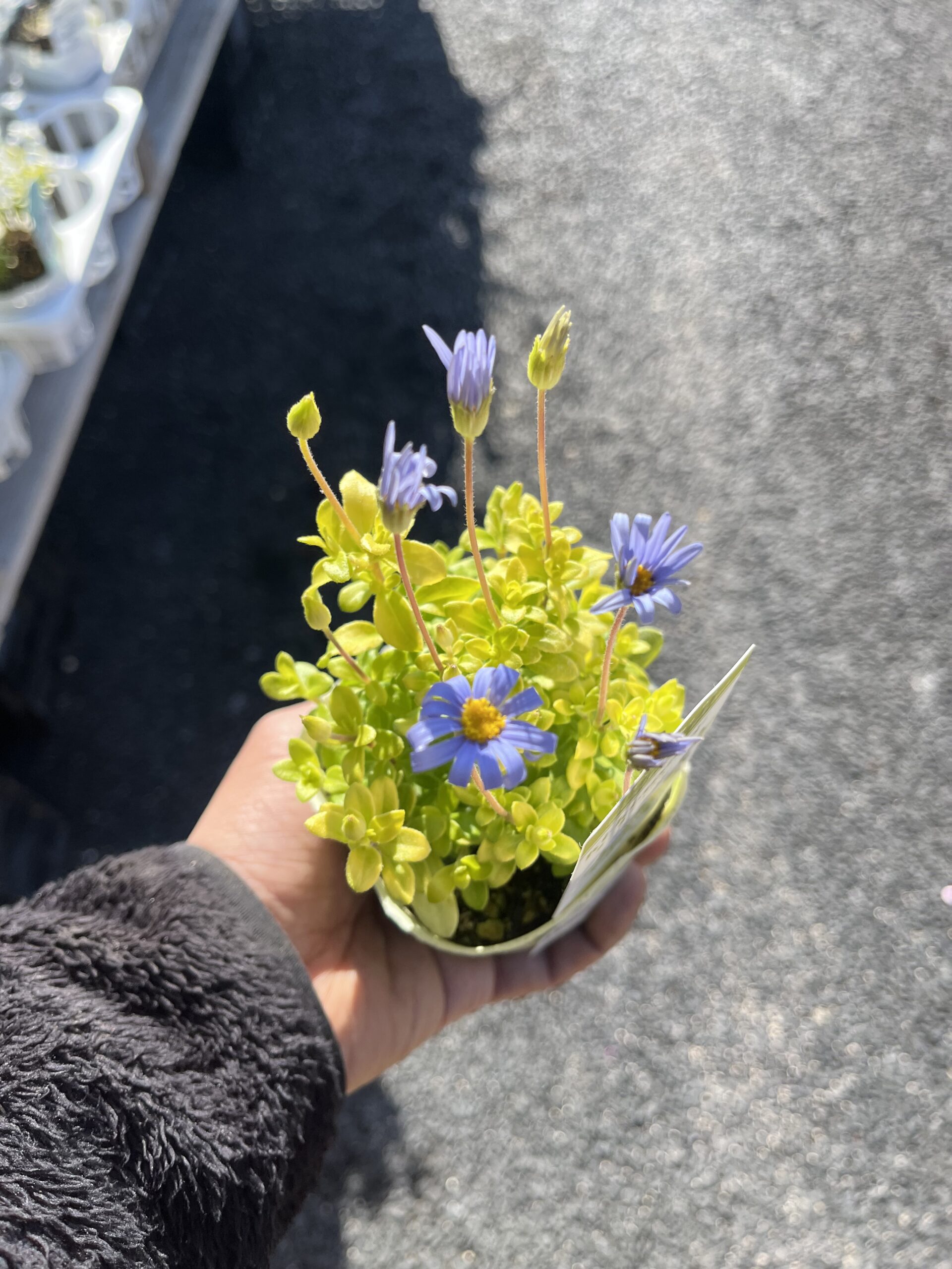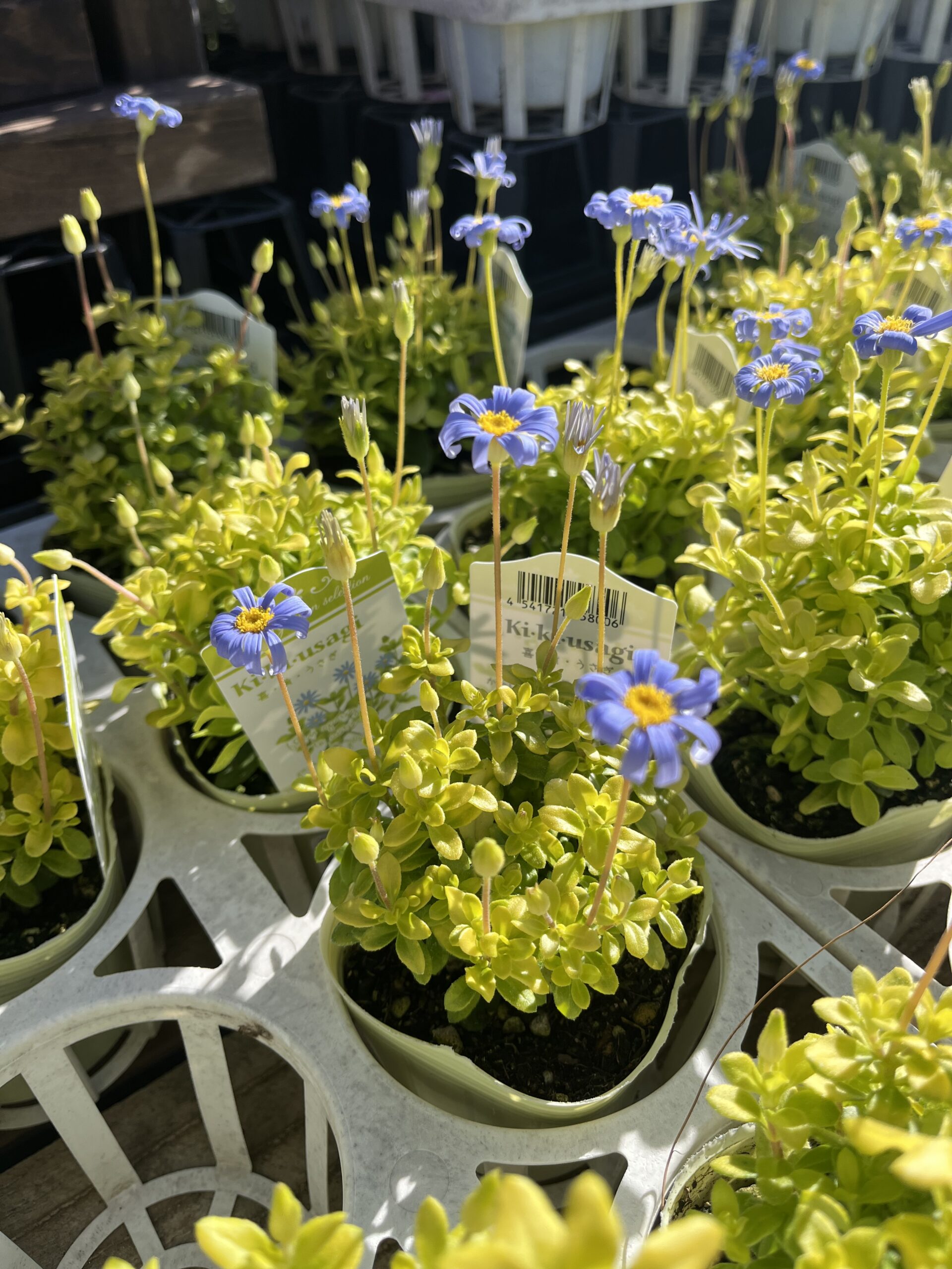 ブルーデージー『喜・黄・うさぎ』半耐寒性多年草:開花期3月~6月頃。喜・喜・緑さんオリジナルブルーデージー。ライムグリーンの葉っぱに爽やかなブルーの品種です。近年の真夏の暑さは苦手です。真夏は日陰に逃がしてあげることをおすすめします。